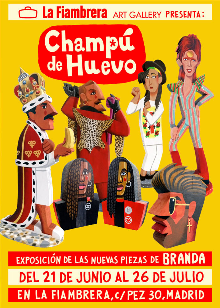 En Champú de Huevo, Branda presenta sus nuevas piezas: una serie de esculturas originales en madera, pintadas a mano, que homenajean a figuras clave de la cultura LGBTI+, además de la escena popular global. Figuras que marcaron la vida de infinidad de personas y que siguen brillando con luz propia a pesar del paso de los años, como es el caso David Bowie, George Michael, Freddie Mercury o Tino Casal, entre otros.